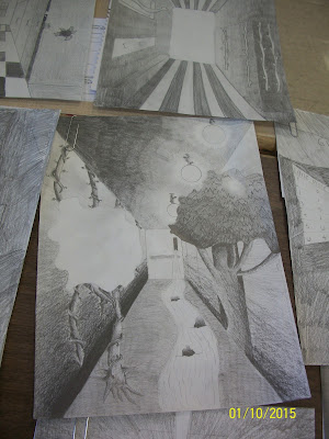 Last step was to add value. Student's identified a light source and then shaded each object or part of the hallway accordingly. Man! Were some people mad that I wasn't letting them use color! However, adding value is a skill and practice makes perfect. Check out these amazing Surreal Hallways!